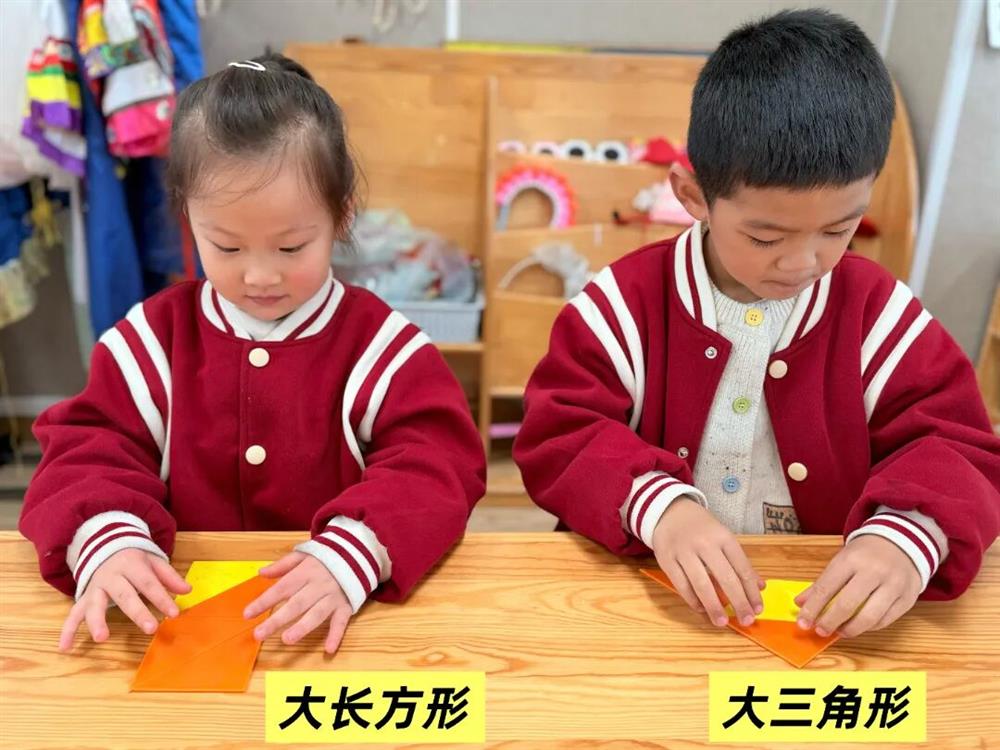 先一起观察图形:如“你看这个长方形绘本有几条长边几条短边?这个叫作长方形”后面的三角形和正方形以此类推……