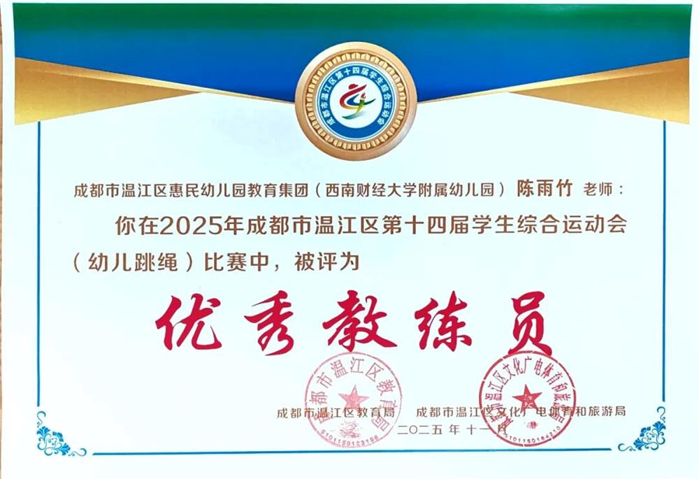 祝贺陈雨竹荣获“优秀教练员”称号。