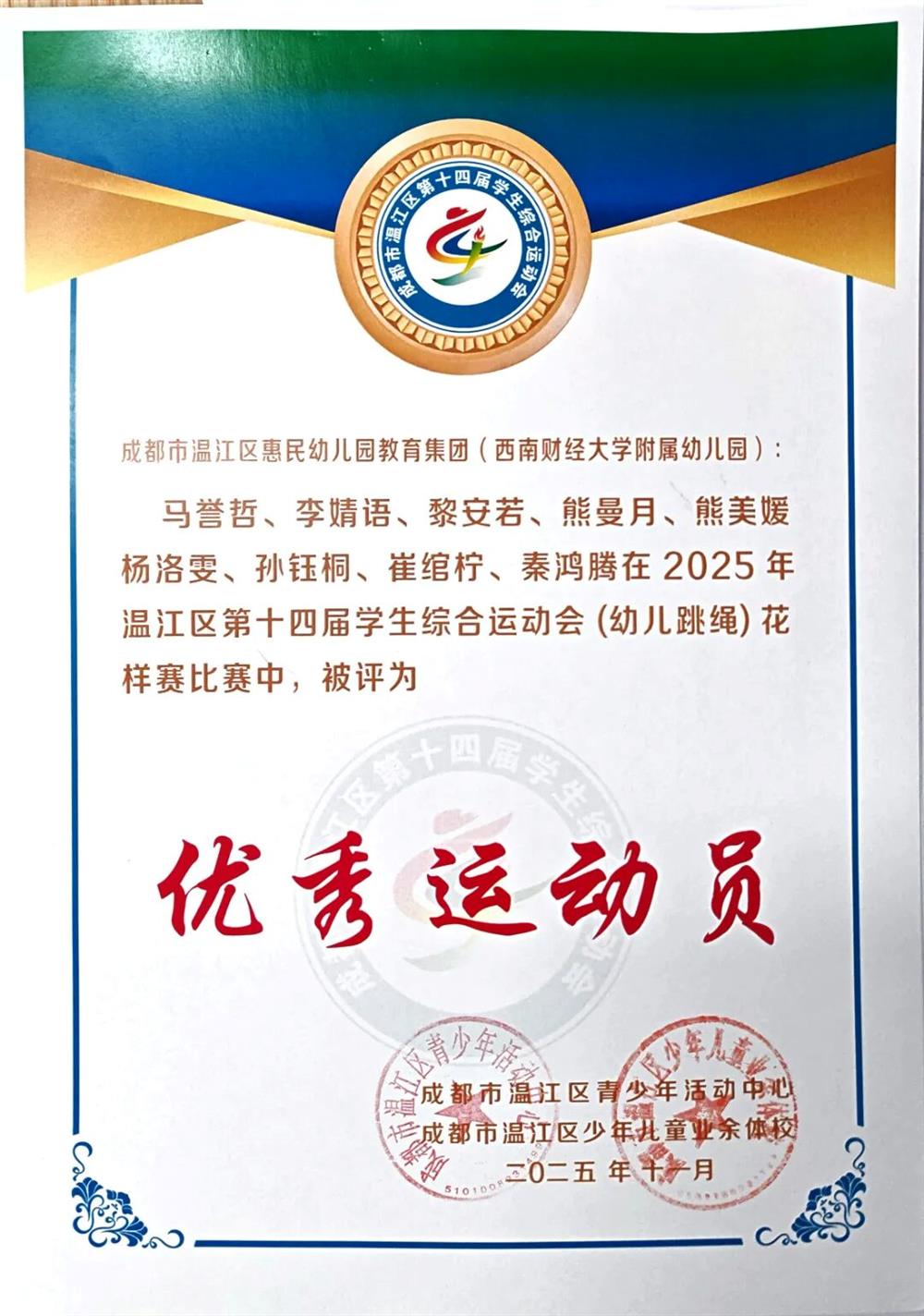 一分耕耘,一分收获。在温江区第十四届学生综合运动会(跳绳)幼儿组比赛中,我园幼儿分别在单摇接力跳绳和集体花样跳绳中喜获佳绩,荣获一等奖。